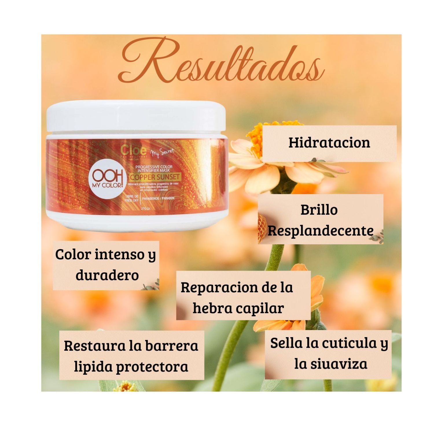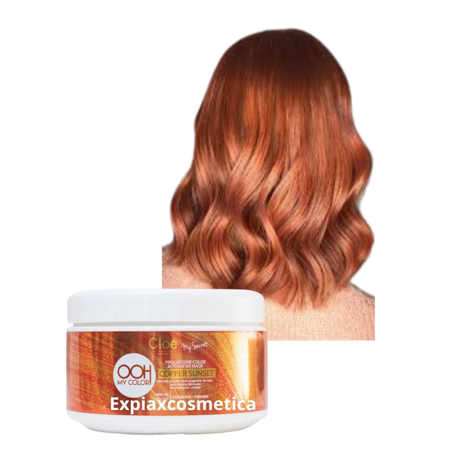 Máscara intensificadora progresivade color de CLOE PROFESSIONAL para cabellos tinturados en Cobres Intensos, que permiten lucircabellos con pigmentación más intensa y duradera, aminorando el deslave delpigmento hasta el siguiente retoque en salón.