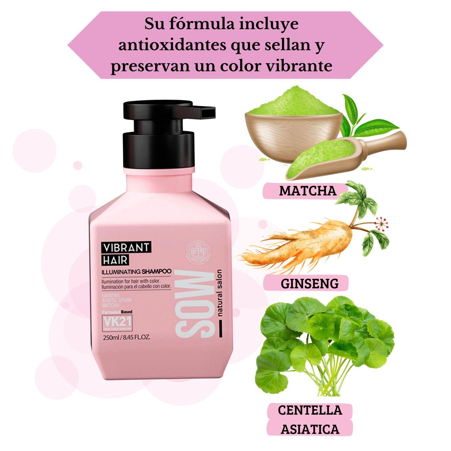 Shampoo Vibrant Hair esta diseñado para iluminar el cabello coloreado. Estimula, nutre y protege, realzando el color y proporcionando un brillo intenso. Su fórmula incluye antioxidantes que sellan y preservan un color vibrante. Con tecnología VK21, que combina una alta concentración de keratina vegetal y tres extractos naturales puros centella asiática, ginseng y matcha, este shampoo fortalece, aporta brillo y suavidad al cabello. Además, repara a nivel molecular, rellena las áreas dañadas y asegura una hidratación profunda.